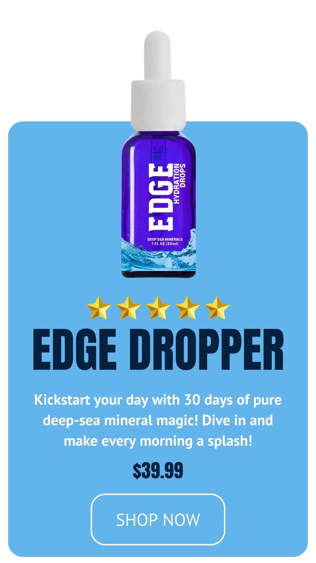 EDGE Drops is an all natural deep sea mineral supplement with no synthetic additives, coloring, flavoring or preservatives. You will not experience the rush nor the associated crash of stimulants like caffeine. Instead you will slowly over time come back to a state of clarity and health as your body easily absorbs vital macro and trace minerals, receives hydration and your digestive system is regulated.